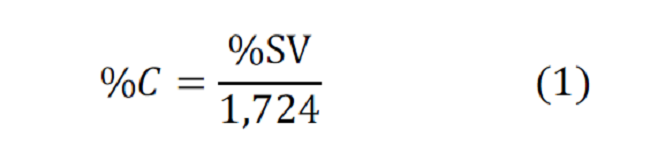 Para la caracterización físico-química de la gallinaza se utilizaron los procedimientos descritos en los Métodos Estándares, 6 y fueron realizados en el laboratorio de Biogás e Ingeniería Ambiental de la Universidad de Santi Spíritus. Se determinaron los sólidos totales (ST) y los volátiles (SV) por el método gravimétrico de ignición, utilizando una estufa marca BINDER y una mufla marca Nabertherm GmbH. El porcentaje de Carbono Orgánico (C) 7 se estimó a partir de los SV, ecuación 1. Se determinó el contenido de nitrógeno amoniacal (N-NH4+) por el método Kjendalh en un destilador modelo Gerhardt Vapodest 10s y la acidez (pH) por potenciometría en un pHmetro modelo PHSJ‐3F.