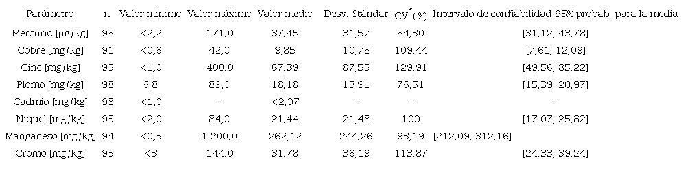 Para el análisis estadístico se utilizó el software Statgraphic Centurion XVI.I.19 Este programa posibilitó determinar parámetros importantes para establecer los niveles de referencia de los MP investigados en los suelos superficiales del área de emplazamiento del Confinatorio Nacional de Desechos Peligrosos Juraguá. Así, fueron establecidos para cada MP, el valor mínimo, el valor máximo, el valor medio, la desviación stándar, los coeficientes de variación (CV) y los intervalos de confianza para la media, con una probabilidad del 95 %. Este intervalo asume que la población de la cual proviene la muestra puede representarse por la distribución normal. Para la mayoría de los MP el sesgo y la curtosis estandrizada estuvieron entre -2 y +2, confirmando este supuesto. Por otro lado, el intervalo de confianza para la media es bastante robusto y no muy sensible a violaciones del supuesto de la normalidad, de aquí su validez.