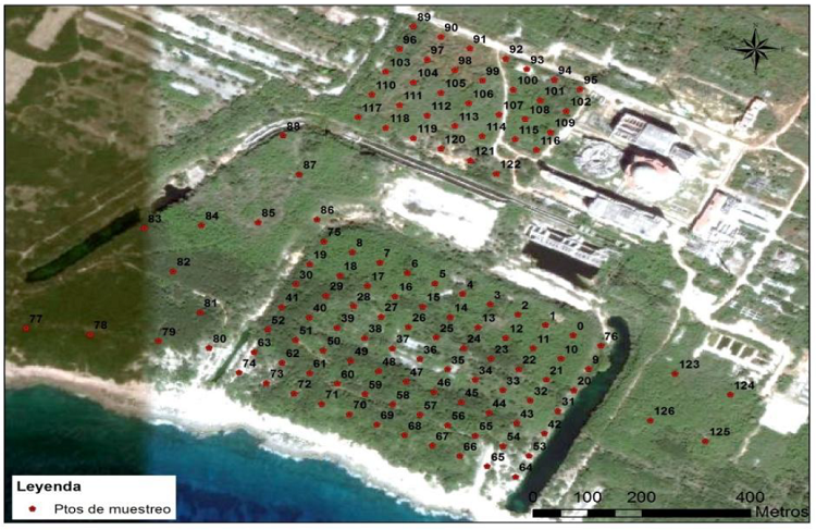 La toma de muestras tuvo lugar entre mayo del 2016 y agosto del 2017. En la figura 1 se identifican los puntos de muestreo de los suelos superficiales en el área de emplazamiento del Confinatorio Nacional de Desechos Peligrosos Juraguá, para la caracterización química de los mismos. Esta área está ubicada en la región centro-sur de Cuba, en la provincia de Cienfuegos y se localiza entre las coordenadas geográficas 22,059 685 y 22,068 076 de Latitud Norte y entre -80,518 236 y -80,506 588 de Longitud Oeste (proyección WGS84). En el área investigada los tipos de suelos que predominan son los ferralíticos, seguidos por los húmicos y una menor área donde predominan los fersialíticos.7
