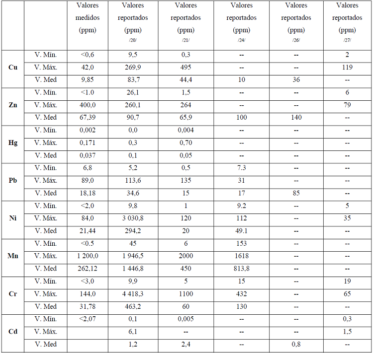 La tabla 2 presenta la comparación entre los valores obtenidos para los metales pesados en el área del emplazamiento del Confinatorio con los valores reportados por otros autores.
