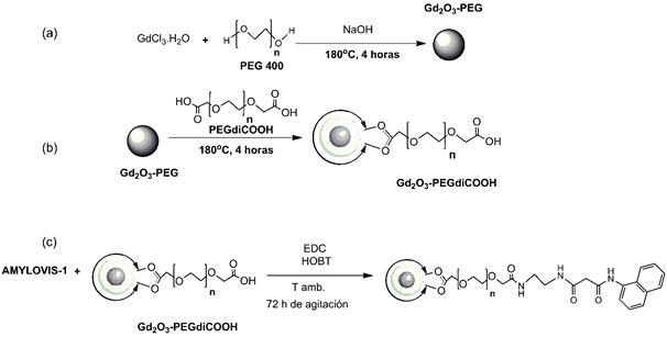 La conjugación de las partículas de Gd2O3-PEGdiCOOH con Amylovis®-1 se llevó a cabo siguiendo el protocolo conocido como reacción de Steglich. Para ello, se seleccionó como agente acoplador la N1-etil-N3-(di-metilaminopropil)carbodiimida (EDC), en presencia del N-hidroxibenzotriazol (HOBT). Así, se forma in situ un éster activado con el PEGdiCOOH que recubre las partículas de Gd2O3 y además, se evita que se produzcan reacciones colaterales, que traerían consigo una disminución del rendimiento. El éster formado se conjuga con el grupo amino libre del Amylovis®-1 a través de un enlace tipo amida.