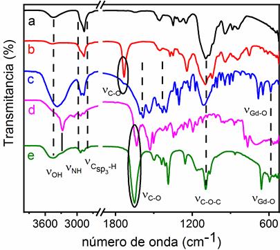 En la figura 2 se muestran los espectros FT-IR de los reactivos de partida, de las partículas de Gd2O3@PEGdiCOOH y Gd2O3@PEGdiCOOH- Amylovis®-1.