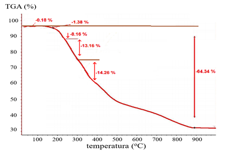 Las G2O3-PEGdiCOOHNPs se caracterizaron mediante TGA (figura 3). En el termograma se observó una pequeña pérdida de masa (0,18%) sobre los 105(C que se asocia al agua de hidratación del compuesto. Desde los 219(C a los 900(C ocurrió una pérdida significativa de masa, de un 64,3 %, que se debió a la descomposición del recubrimiento orgánico de las partículas.
