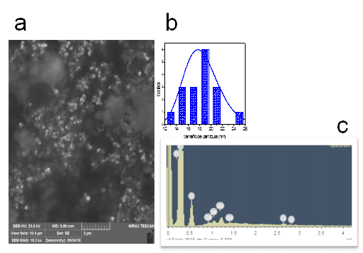 La morfología de las partículas y su distribución Gd2O3-PEGdiCOOH-Amylovis®-1 se analizó mediante la microscopia electrónica de barrido (SEM) (figura 4a y 4b). En esta micrografía se muestra que las nanopartículas sintetizadas tienen forma quasiesférica, con un diámetro promedio de 18,4 ± 2,9 nm. También se observan regiones con una alta polidispersidad o aglomeración, que pudiera atribuirse al método de síntesis empleado. La presencia del ión metálico en las partículas esféricas se corroboró mediante microanálisis por dispersión de rayos X (EDX), con la presencia de la señal de la línea L del Gd (figura 4c). Además, se detectaron los elementos sodio y cloro que sugieren que el proceso de purificación no fue eficiente. Por tanto, sería recomendable dializar como una alternativa para eliminar dichas impurezas en trabajos futuros.