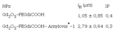 Como se observa en la tabla 1, al conjugar Amylovis®-1 a las partículas Gd2O3-PEGdiCOOH se observa un incremento del diámetro hidrodinámico. Estos valores se encuentran por encima de los valores que permitirían el traspaso pasivo de la membrana hematoencefálica. Lo anterior conlleva al diseño de nuevas metodologías de síntesis que permitan obtener nanopartículas con diámetros hidrodinámicos por debajo de los 200 nm.