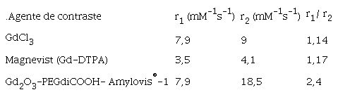 Si se compara los valores de r1, r2 y r2/r1 de las partículas de Gd2O3-PEGdiCOOH- Amylovis®-1 con los del Magnevist (agente de contraste comercial de uso clínico), se observa que presentan un mayor valor de r1. No obstante, la relación r2/r1 del producto sintetizado en este trabajo resultó de 2,4, mayor que la del Magnevist.