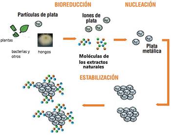 De la síntesis mediante el uso de plantas se obtienen extractos con alto poder antioxidante. La reducción inicial de iones metálicos induce a la formación de centros de nucleación. Estos centros secuestran iones metálicos adicionales y también incorporan lugares vecinos de nucleación que conducen a la formación de nanopartículas. Además, como estas partículas están asociadas a restos orgánicos de los extractos de plantas, en ocasiones, se consigue estabilizar esas partículas de tamaño nanométrico e impedir que se agreguen.37