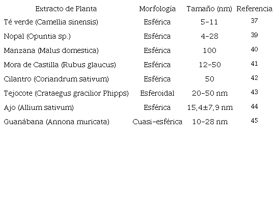 En la literatura se han reportado investigaciones acerca de la síntesis de nanopartículas de plata a partir de biomasa muerta.38 Estos extractos de plantas son particularmente atractivos, por la facilidad del manejo de estos medios reductores biológicos, aunque en ocasiones es necesario emplear agentes estabilizantes adicionales para evitar la aglomeración de las nanopartículas obtenidas. La tabla 1 muestra ejemplos de extractos de plantas empleadas para la síntesis de nanopartículas de plata.