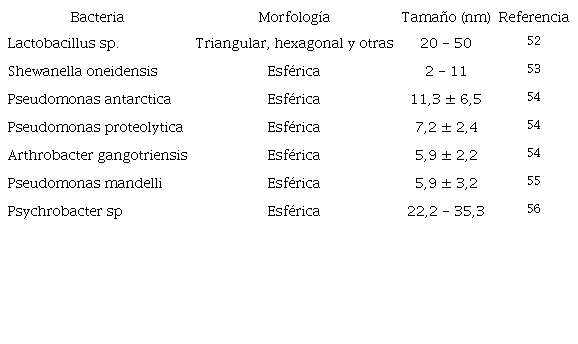 La tabla 2 muestra ejemplos de bacterias que han sido utilizadas para la síntesis de nanopartículas de plata. Sin embargo, en los últimos años la tendencia en las investigaciones en esta temática es hacia la utilización de extractos de plantas y hongos debido a su mayor rendimiento y su fácil manejo.50,51