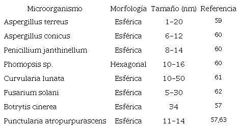 Son numerosas las especies de hongos empleadas para la síntesis de nanopartículas metálicas pertenecientes a los Ascomicetes: Alternaria, Aspergillus, Cladosporium, Colletotrichum, Fusarium, Trichoderma, Trichothecium, Penicillium, Phoma, Verticillium. En menor medida se han usado basidiomicetes: Ganoderma lucidum, Pleurotus sajor caju, Volvariella speciosa.51 La tabla 3 resume algunos de los reportes de la síntesis de nanopartículas de plata empleando hongos.