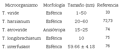 Uno de los primeros estudios realizados con diferentes especies del hongo Trichoderma para la síntesis de nanopartículas de plata fue en 2013 por Prameela-Devi y colaboradores, donde se evidenció la aplicación de T. asperellum, T. harzianum, T. longbrachiatum, T. pseudokoningii y T. virens. Se comprobó la producción de AgNPs extracelular al obtener un máximo de intensidad a los 420 nm en estudio de espectrofotometría UV-VIS, el que se corresponde con la resonancia plasmónica de las AgNPs. La síntesis se desarrolló en frascos de vidrio de 250 mL de capacidad; las variables fijas fueron pH = 8,5, temperatura = 40 °C y tiempo de reacción = 120 h. Se obtuvieron AgNPs de tamaños entre 8 y 60 nm y una morfología isotrópica. La solución mantuvo la estabilidad después de un mes, sin evidencia de agregación de partículas.71 En otras investigaciones más recientes se han empleado diferentes especies de este hongo (tabla 4).