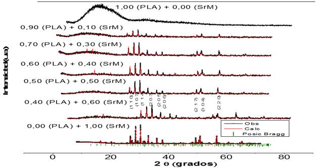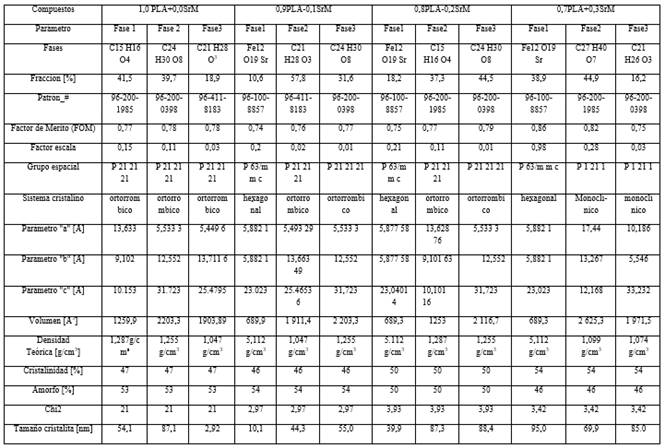 En la tabla 2 se reportan los resultados principales de la caracterización estructural y micro estructural (fórmula química, fracción en por ciento, factor de mérito, grupo espacial, sistema cristalino, parámetros de la red, y volumen de la red, densidad teórica, por ciento de cristalinidad, por ciento de fase amorfa, chi cuadrado y tamaño promedio de las cristalitas) de los compuestos caracterizados por DRX, obtenidos a través de la determinación de las fases principales de cada muestra bajo estudio, para las menores concentraciones de PLA. Se observa que el PLA está compuesto por 2 fases básicas (en proporciones menores que los compuestos agrupados en la tabla 1) que varían de una muestra a otra. Esto puede estar relacionado con la degradación del polímero en el tiempo y el proceso de interacción que ha ocurrido entre el polímero y la cerámica, con las variaciones de sus concentraciones relativas en el interior de la matriz, desde 40 al 100%, con respecto a la concentración de la cerámica SrM, que constituye la fase mayoritaria del sistema inorgánico, el cual comparte con un 6% de Fe2O3. Análogamente los volúmenes de la celda unidad de cada fase dentro de cada sustancia y su densidad teórica, teniendo pequeñas variaciones respecto a lo reportado en cada patrón de la base de datos consultada.24