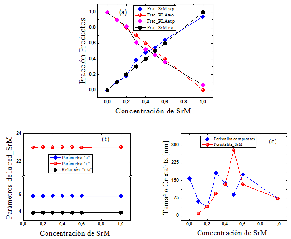 En figura 2 se reportan la dependencia de fracción de las fases de PLA y de SrM, teórica y experimental (a); parámetros de la red (“a”, “b” y “c/a”) para la SrM (b) y por último el tamaño promedio de las cristalitas de los compuestos y de la cerámica (c) en función del rango de concentración de la misma.