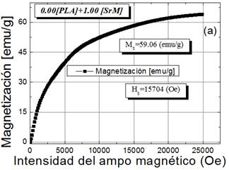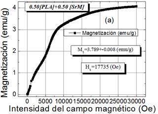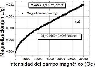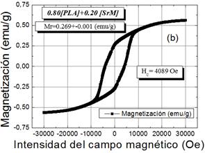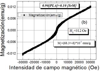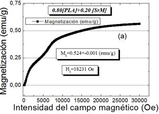 En la curva de magnetización inicial (figura 3a.) se observa que el compuesto para bajas intensidades de campo magnético (menores de 3.0 KOe) tienen una pendiente diferente que puede deberse a la pequeña fracción de SrM en la matriz (comportamiento ferrimagnético) y a partir de ahí tiene un comportamiento paramagnético relacionado con el PLA, lo cual se verifica en la figura 3b por su tendencia a hacer un lazo de histéresis apreciable. Ambos comportamientos confirman lo visto en el análisis estructural y micro estructural que mostró que ambas fases coexisten en el compuesto de forma independiente y funcional, desde el punto de vista de sus propiedades físico-químicas.