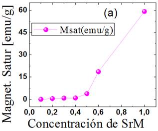 En la figura 7a se reporta la dependencia de la magnetización de saturación en función de la concentración de SrM para cada muestra del compuesto bajo estudio. Se observa que el comportamiento es diferente a lo reportado en 6, en 13, para la ferrita de níquel y manganeso dispersas en una matriz de polianilina y lo reportado en 12 para compuestos híbridos de X(SrFe12O19) + (1-X) (BiFeO3), pues la curva muestra un cambio sustancial a partir de valores de concentración de SrM superiores al 50 %. Lo anterior demuestra que para bajos valores de concentración de la fase ferrimagnética son decisivos en las propiedades intrínsecas del compuesto (como la magnetización de saturación) el tamaño nano métrico de las partículas y las interacciones electromagnéticas entre las dos sustancias constituyentes a nivel de sus fronteras de granos.