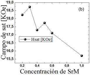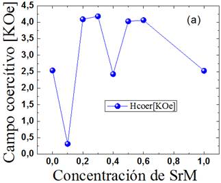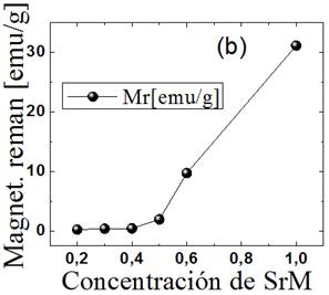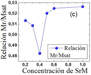 En la figura 7c se observa la dependencia de la razón entre la magnetización remanente y la de saturación con la concentración de SrM en cada muestra del compuesto bajo estudio. La magnetización remanente es una magnitud intrínseca que depende básicamente de la forma y tamaño de las partículas magnéticas; es por ello que el comportamiento de esta relación es prácticamente inverso a la dependencia del tamaño de las cristalitas de la fase ferrimagnética (figura 2c) condicionada por los efectos nano métricos presentes en la magnetización de saturación.