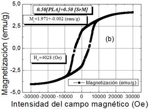 En el rango de valores de campo magnéticos 2500 Oe y 9000 Oe se observa la existencia de al menos dos fases magnéticas más que pueden deberse a la pequeña proporción de Fe2O3 y otra debida a los cristales del polímero interactuando con los átomos de hierro de la SrM. Todo lo anterior se corrobora con el lazo de histéresis de la figura 4b que es típico de la SrM, pero con un campo coercitivo mucho mayor (mayor dureza magnética), aunque con magnetización remanente en la proporción adecuada respecto a la magnetización de saturación de este compuesto multifuncional.