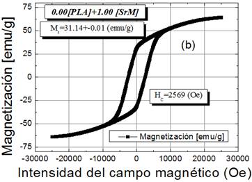 En la curva de magnetización inicial (figura 4a) se observa ya el comportamiento típico de la SrM pero con valores de magnetización de saturación muy pequeños y campos de saturación muy altos respecto a los típicos de esta hexaferrita, lo que pudiera ser explicado por el hecho de que la fase polimérica modula las propiedades magnéticas del compuesto en una proporción dada por los tipos de interacciones electromagnéticas que tienen lugar entre la fase cerámica y la matriz polimérica.