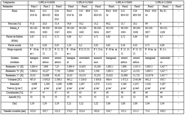 En la tabla 1 se reportan los parámetros resultantes de la caracterización estructural y micro estructural (fórmula química, fracción en por ciento, factor de mérito, grupo espacial, sistema cristalino, parámetros de la red, volumen de la red, densidad teórica, por ciento de cristalinidad, por ciento de fase amorfa, chi cuadrado y tamaño promedio de las cristalitas) de las fases presentes en cada compuesto caracterizado por DRX, obtenido a través de la determinación de las fases principales de cada muestra bajo estudio, para las mayores concentraciones de PLA. Se observa que el PLA está compuesto por 3 fases básicas que varían de una muestra a otra. Esta variación puede ser el resultado de la degradación del polímero con el tiempo y al proceso de interacción que ha ocurrido entre el polímero y la fase ferrimagnética, con las variaciones de sus concentraciones relativas en el interior de la matriz desde 0 % al 30 % respecto a la concentración de la cerámica SrM, que es la fase mayoritaria de la sustancia inorgánica. Se reportan los volúmenes de la celda unidad de cada fase dentro de cada sustancia y su densidad teórica, teniendo pequeñas variaciones respecto a lo reportado en los patrones de la base de datos consultada. 24 Estas variaciones han sido vinculas con el tamaño de las cristalitas constituyentes en cada caso, que en estas muestras son del orden de las decenas de nanómetros. La cristalinidad de cada muestra es próxima al 50 % debido a la presencia de la matriz polimérica de PLA y al tamaño nanométrico de las cristalitas del compuesto cerámico.