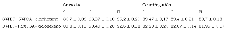 ). Se comprobó que la centrifugación es necesaria para obtener una adecuada separación. Se optimizó la formulación TBF-TOA-ciclohexano para la extracción de una actividad de