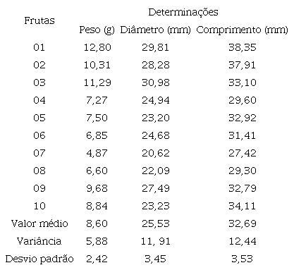 O quadro 1 mostra os valores de peso, comprimento e diâmetro dos frutos utilizados neste experimento.