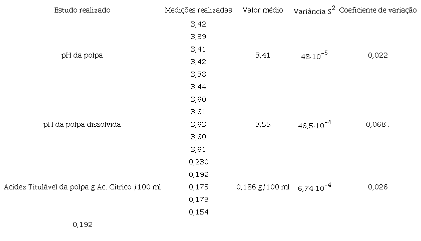 O teor de sólidos solúveis é um parâmetro que tem sido usado como indicador da qualidade dos frutos. O mesmo é de grande importância nos frutos, tanto para o consumo in natura como para o processamento industrial, visto que elevados teores desses constituintes na matéria-prima, implicam menor adição de açúcares, menor tempo de evaporação da água, menor gasto de energia e maior rendimento do produto, resultando em maior economia no processamento.22 O valor médio encontrado para amostra de polpa é de 9,51º Brix, ligeiramente superior ao valor de 8,88° Brix reportado por Zaicovski.18 Françoso refere um valor de 9° Brix.1 Oliveira determinou um valor de 6,80º Brix.15 O valor experimental medido pode dar uma ideia do nível de maturação da fruta.