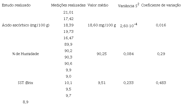 O valor médio do teor de humidade encontrado neste trabalho foi de 90,25 % (quadro 3). O mesmo resulta muito semelhante aos reportados por outros investigadores. Os valores de variância e desvio padrão são pequenos, o que indica também uma pequena dispersão dos resultados. Oliveira y colaboradores encontraram um valor de 89,4 %.15 Eles afirmam que o conteúdo de água diminui à medida que o fruto amadurece. Izidoro y colaboradores tiveram um valor de 92,48 %, ligeiramente maior.21