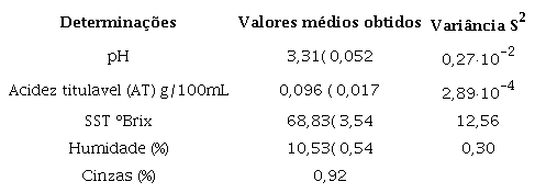 O teor de sólidos solúveis fornece um indicativo sobre a quantidade de açúcares que estão presentes nos alimentos. O quadro 4 mostra o valor médio obtido de 68,83 °Brix que resultou inferior ao reportado por Chim de 74 °Brix.25 Embora este alto valor de SST seja característico de doces e geleias. O teor de açúcares solúveis nos doces dos frutos, normalmente oscila entre 65 a 85 °Brix.25 Esta constitui uma característica principal.