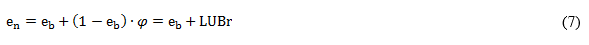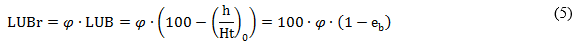 Para el cálculo de la cantidad de carbón reaprovechable o recuperable, no es suficiente el criterio del valor de LUB, pues debe tenerse en cuenta, además como criterio, la amplitud de la ZTM que define nivel de agotamiento específico de la capa, donde debe hacerse el “corte” en el adsorbedor para calcular la cantidad de carbón recuperable. Esto quiere decir, que en dependencia de la amplitud de la ZTM, solo una fracción de la LUB puede ser recuperada en el proceso del ron. Se establece entonces el criterio de LUB recuperable (LUBr), que puede interpretarse además como un valor de eficiencia de recuperación del lecho, y matemáticamente puede definirse por la ecuación (5)