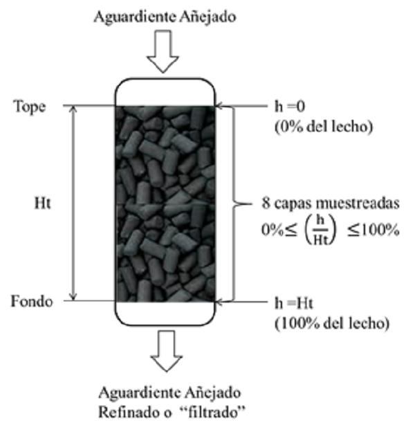 Se seleccionaron cuatro roneras del centro y occidente del país, para evaluar el perfil de agotamiento de sus adsorbedores, aplicando el método S-NH3. De cada ronera se seleccionó un filtro considerado como “agotado” a partir del juicio sensorial de los respectivos especialistas. De cada adsorbedor “filtro”, se tomaron ocho muestras a distintas profundidades del lecho de carbón en dependencia de la altura de cama del adsorbedor desde el tope hasta la capa del fondo, como muestra la figura 1. A cada capa de carbón muestreada se definió su profundidad porcentual en el lecho como la relación de la profundidad de toma de muestra (h) con respecto a la altura/profundidad total de la cama (Ht) como (h/Ht) (en %). Toda muestra tomada resulta de la mezcla de cinco muestras radiales en cada capa del lecho, para garantizar la representatividad del agotamiento en cada capa del lecho. Para el muestreo del lecho, se aplicó una toma de muestras específica, patentado en Cuba (Patente No: 2016-0178).