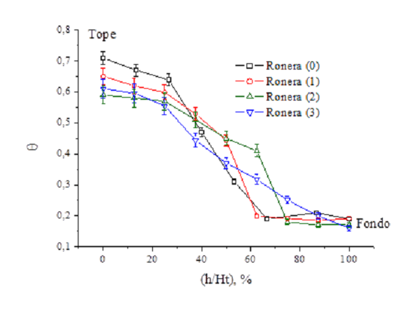 La figura 2 presenta las curvas del perfil de agotamiento de los filtros agotados de las diferentes roneras. Según los datos presentados en la tabla 1, en todos los casos se observa un gradual aumento de la capacidad adsortiva entre las capas del tope y el fondo del filtro. Primeramente, las capas en el rango de 0-20 % del lecho presentan niveles de agotamiento bastante cercanos, seguido de las capas de carbón ubicadas en el rango de 20-75 % del filtro, donde se evidencia una caída abrupta de θ en el que aparecen las mayores diferencias en el nivel de agotamiento de los carbones dentro del adsorbedor. En esta región del filtro se encuentra la zona de transferencia de masa (ZTM) y el frente de la onda de adsorción.4,8,13