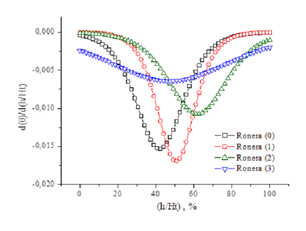 El valor mínimo de las curvas diferenciales indica el punto de la cama de carbón donde ocurre el cambio de mayor pendiente en el grado de agotamiento de una capa a otra. En este punto de la cama del adsorbedor, el cual coincide con el parámetro (h/Ht)0 del modelo de Boltzmann, es donde se encuentra el frente de la onda de adsorción de la ZTM del adsorbedor.4,8,13