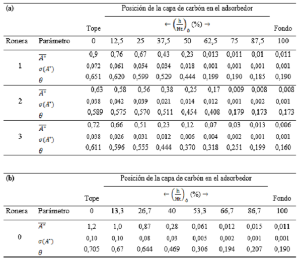 La tabla 3 muestra las eficiencias de uso de lecho de cada uno de los adsorbedores estudiados. Se puede decirse que la más alta eficiencia de aprovechamiento del carbón la tiene la ronera 2, con un valor de alrededor de 0,62 o 62 %, seguido en orden decreciente por las roneras 1, 3 y 0.