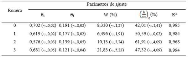 La tabla 2 muestra los parámetros y calidad del ajuste de los perfiles de agotamiento de los diferentes adsorbedores al modelo de Boltzmann. En todos los casos, la bondad de ajuste fue satisfactoria con coeficientes de regresión por encima del 96 %. En específico, θi y θf son constantes del modelo, relativas a los coeficientes fraccionales de recubrimiento de las capas del tope y fondo del adsorbedor, respectivamente. Por otro lado, las constantes d(h/Ht) y