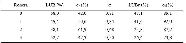 Basado en la eficiencia neta como criterio, se puede evaluar la eficiencia del manejo en las roneras objeto de estudio. El manejo más eficiente se puede lograr bajo el perfil de la ronera 1, seguido de las roneras 0 y 2, respectivamente; quedando con la menor eficiencia de manejo la ronera 3, la cual debe lograr un perfil más definido en la ZTM, como se explicó anteriormente, para lo que se sugiere disminuir el flujo de aguardiente en operación, o aumentar el diámetro del lecho.