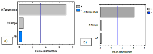 El diagrama de Pareto muestra cada uno de los efectos estimados en orden decreciente de magnitud. La longitud de cada barra es proporcional al efecto estandarizado, lo que es equivalente a calcular un estadístico-t para cada efecto. En este caso, solo la temperatura es significativa para ambos análisis (figura 1), lo que coincide con lo reflejado anteriormente.