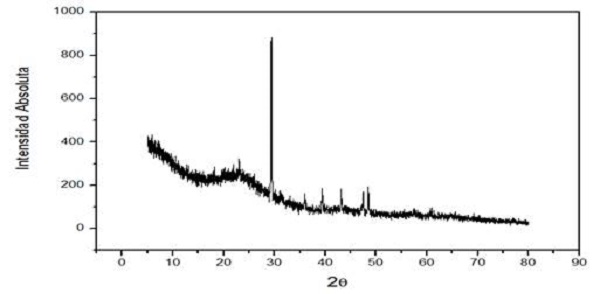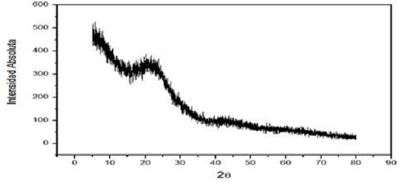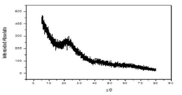 Las figuras 9-11 muestran los difractogramas de los biocarbones obtenidos. Estos corresponden a una estructura amorfa, concordante con lo esperado en un sólido poroso. En las figuras se observan dos picos anchos característicos, los cuales fueron identificados usando la base de datos JCPDS del International Centre for Diffraction Data (ICDD-2007). El pico de menor intensidad ubicado alrededor de los 44° se asigna al plano grafítico d100, y el de mayor intensidad ubicada alrededor de los 24° se asigna al plano grafítico d002. Este último se distingue como un pico ancho característico de carbones. Ambos picos son similares a los reportados por Pinedo 15 en sus carbones activados modificados. En el difractograma de Fernán Sánchez, la identificación de otros picos a menores a distancia interplanares, hace inferir la presencia de material inorgánico, que puede estar relacionado con la mayor cantidad de cenizas, demostrada por el EDX y análisis inmediato y la presencia de carbonato de calcio.