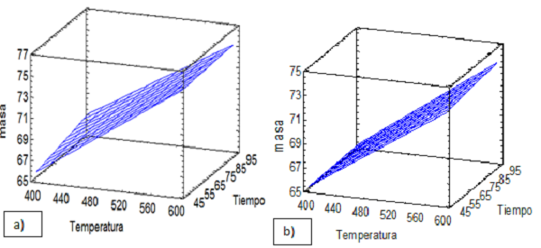 Al observar los diagramas de superficie de respuesta (figura 2), se demuestra la mayor influencia de la temperatura con respecto al tiempo, sobre la variable respuesta. De estos diagramas podría inferirse la necesidad de estudiar intervalos de temperatura superiores a 600 (C, pero es ampliamente conocido en la literatura que pirolizar a temperaturas superiores a esta, incrementa las pérdidas del carbón por volatilización del mismo.