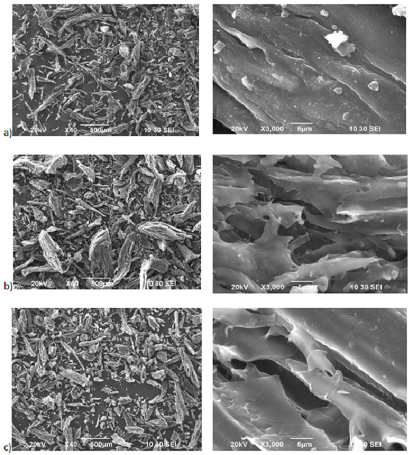Las micrografías de los biocarbones obtenidos para Teca a), Guachapelí b) y Fernán Sánchez c) se muestran en la figura 4. En las mismas se aprecia un cambio en la morfología superficial de las microfibras, con relación a las maderas, lo que indica la ocurrencia de las reacciones involucradas en la pirólisis. El mayor craqueo pirolítico de las microfibras del carbón procedente de Fernán Sánchez demuestra la menor dureza de esta madera, aspecto que fue relacionado con el más alto contenido de oxígeno, identificado a través del análisis elemental de las maderas 12, que refiere una composición enriquecida en carbohidratos, lo que favorece una mayor degradación a estructuras más sencillas, durante el proceso de termoconversión.