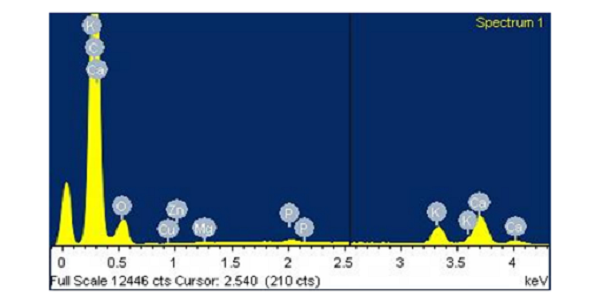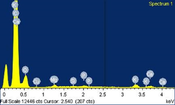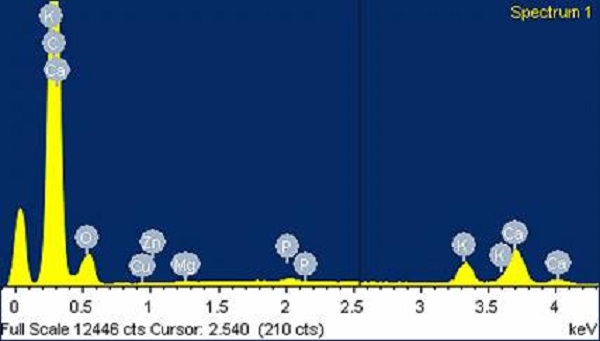 Por esta técnica solo se determina el contenido de elementos con número atómico mayor que el boro (B), por eso no se registran líneas de hidrógeno. En el caso del biocarbón de Teca, se vuelve a identificar restos de silicio, de manera similar a su madera, lo que se explica por los suelos arenosos en que se desarrolla esta especie. Los componentes inorgánicos corresponden a las cenizas. La presencia de potasio y calcio son de importancia significativa cuando el biocarbón obtenido es utilizado como remediador de suelos, debido a que estos minerales son nutrientes necesarios para el crecimiento de las plantas.