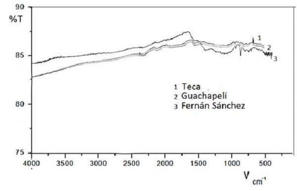 Los espectros infrarrojos se registraron entre 4 000 cm-1 y 400 cm-1 en un ATR-FTIR modelo Perkim Elmer FTIR BX. Las datas fueron procesadas para la confección de los gráficos con el software Origin 6.1.14