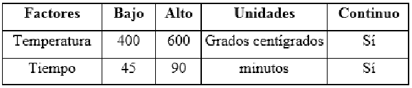 Las variables independientes son el tiempo y la temperatura, y la variable respuesta es el porcentaje de masa volatilizada, calculada a partir de la diferencia entre la masa inicial y la masa final para cada experimento de pirólisis. En la tabla 1 se asignan los límites de las variables de trabajo.