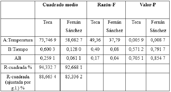 La tabla 2 muestra el análisis de varianza para cada uno de los efectos principales en los diseños aplicados a las maderas Teca y Fernán Sánchez. Se demuestra, para ambas maderas, que la temperatura es el único factor que afecta significativamente la variable respuesta, teniendo valores -P menor que 0,05 con un nivel de confianza del 95,0 %.