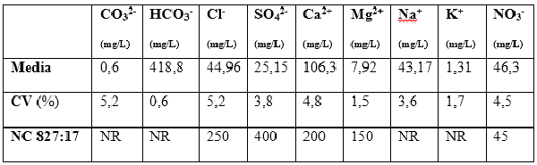 Como se puede observar los Cl-, SO42-, Ca2+, Mg2+, están por debajo del nivel máximo permitido por la NC 827:17, por lo que no constituyen problema alguno de riesgo; excepto el NO3- que si supera el valor máximo permitido por norma. El contenido de los otros iones determinados no son reportados en la norma. Vale destacar, de ellos, el valor muy alto obtenido (respecto a los otros iones) para el HCO3-; además el valor obtenido para K+ (1,31 mg/L), independientemente de que no esté reportado en la norma empleada, es un valor de concentración superior al nivel máximo permisible para aguas de diversos usos según normativas internacionales (1 mg/L.20 Por tanto, su presencia en estas aguas indica contaminación de las mismas.