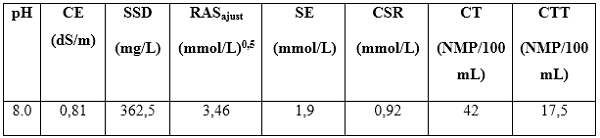 Se midió el pH y la conductividad eléctrica (CE), por medida directa con equipos destinados a este fin, y mediante análisis de laboratorios se determinó el nivel de Sales Solubles Disueltas(SSD), CO32-, HCO3-, Cl-, SO42-, NO3-, Ca2+, Mg2+, Na+, K+, Coliformes Totales (CT) y Termotolerantes (CTT) y se calcularon los indicadores: Relación de Absorción de Sodio (RAS), Relación de Absorción de Sodio ajustada (RAS ajust), Salinidad Efectiva (SE) y Carbonato Sódico Residual (CSR) como especifica la norma cubana de preservación del suelo.14