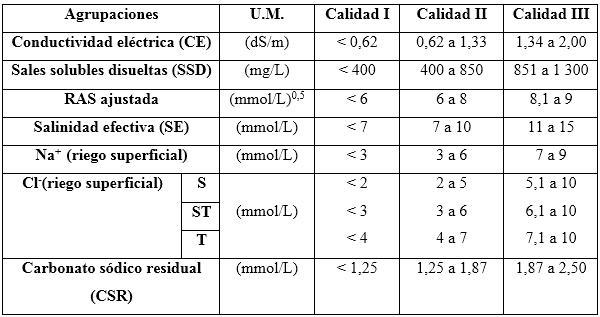 La evaluación de la calidad del agua se regirá, como indica la norma cubana de preservación del suelo (14), mediante la valoración de los indicadores de requisitos técnicos de su composición que determinará la clasificación y posibilidades de uso de la misma en 3 categorías: Superior (Calidad I), Primera (Calidad II) y Segunda (Calidad III). La calidad del agua está en dependencia las propiedades físicas e hidrofísicas de los suelos y tipo de cultivos en los que va a incidir.