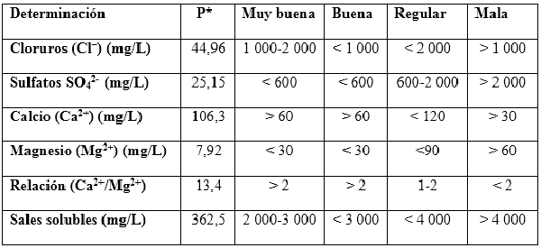 En la tabla 5 se muestra una clasificación del agua para bebida animal según el contenido de diversos iones; además de los resultados de los mismos obtenidos en esta investigación (P*).