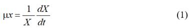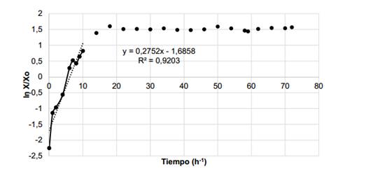 La velocidad específica máxima de crecimiento µmáx (h-1) se calculó a partir del gráfico ln X/Xo vs t, mediante un análisis de regresión lineal de la fase logarítmica en la curva de crecimiento celular.