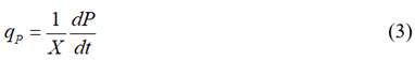 Se determinaron los parámetros cinéticos velocidad específica de crecimiento celular (µx, h-1), velocidad volumétrica de formación de producto (rp , g L-1 h-1) y la velocidad específica de formación de producto (qp , g g-1 h-1), calculadas por las ecuaciones (1)-(3), respectivamente