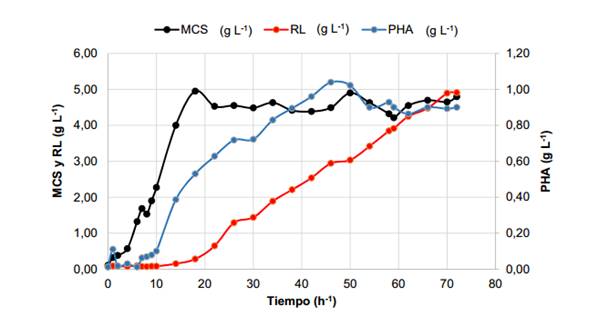 El estudio de la producción simultánea de ramnolípidos y polihidroxialcanoatos se ha reportado por varios autores y los resultados varían, en función de las condiciones de cultivo y de las cepas microbianas empleadas. Hori y col. (2002)1 observaron que la producción simultánea comenzó cuando cesó el crecimiento microbiano en el cultivo de la bacteria P. aeruginosa IFO3924, utilizando decanoato como fuente de carbono. Un comportamiento similar reportaron Marsudi y col. (2008)21, durante la producción simultánea de ramnolípidos y polihidroxialcanoatos por esta misma cepa (P. aeruginosa IFO3924) en condiciones de cultivo análogas, pero utilizando ácido oleico, aceite de palma y glicerol.